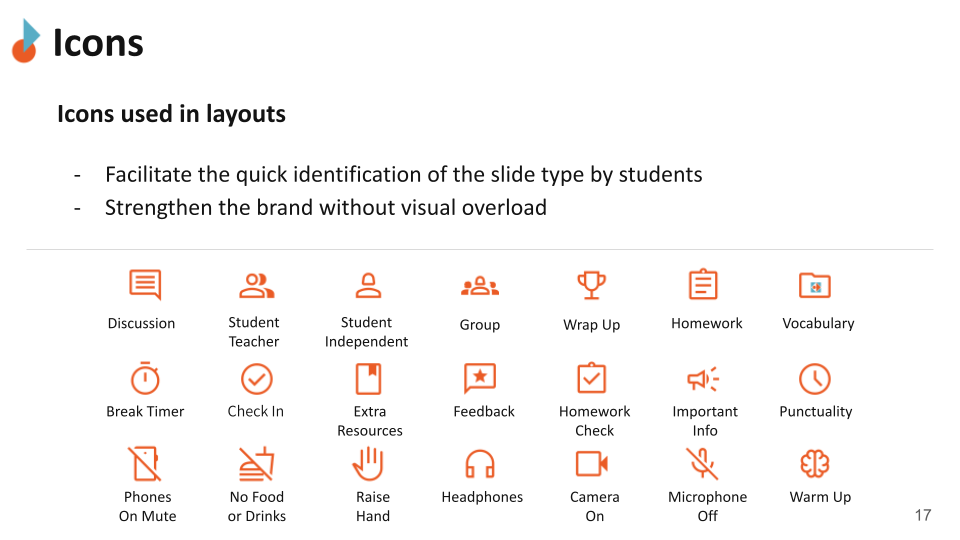 21 icons signal activity types and class etiquette rules, strengthening the brand without adding visual overload. Suggested icons are also available for easy use.