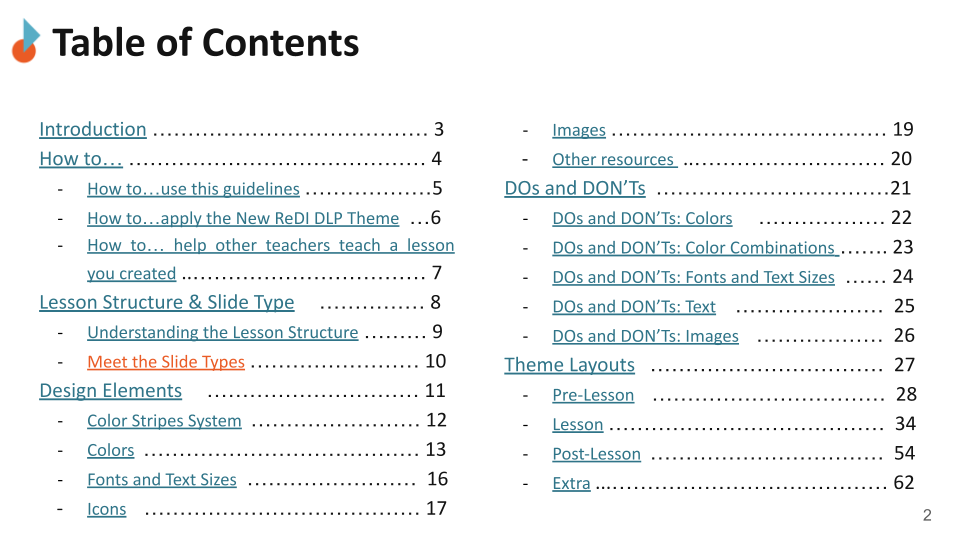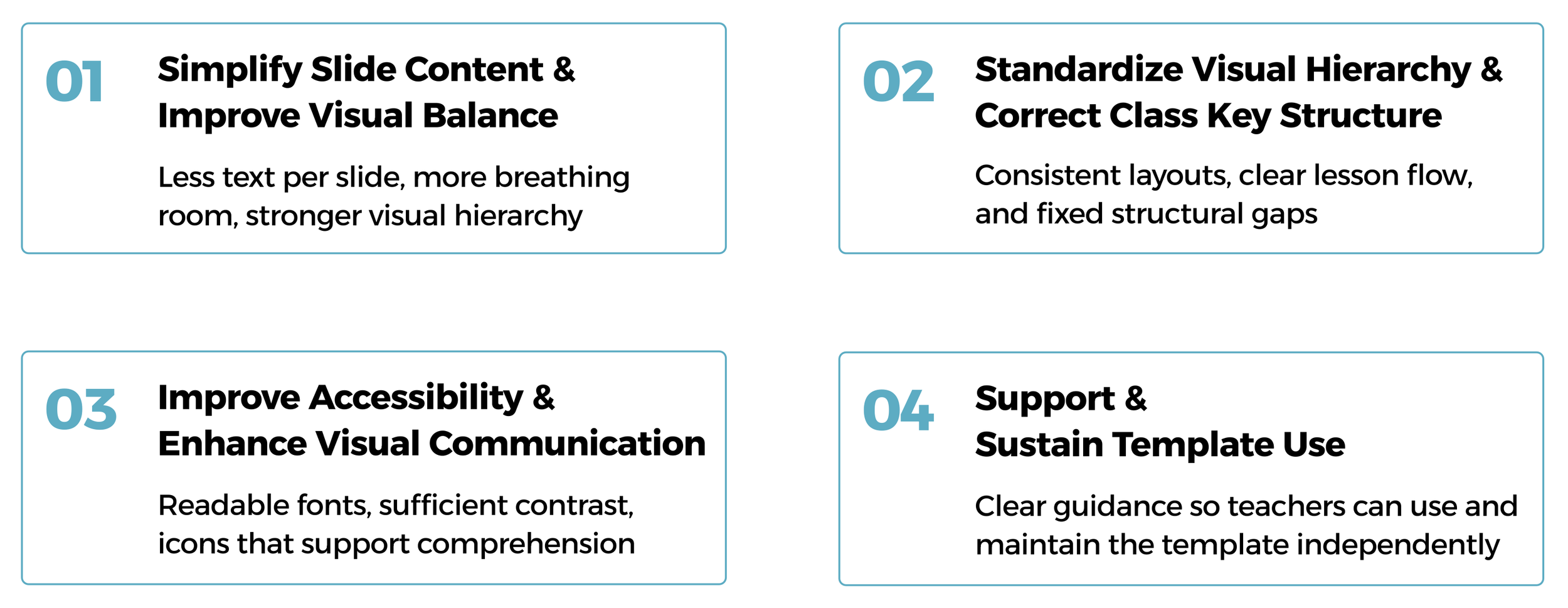 The redesign addressed both problems in parallel: a new slide template to improve clarity, accessibility, and consistency in the classroom — and a 62-page usage guide to make sure the improvements would last.