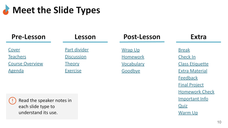 The guide explains the full lesson flow and introduces all 21 slide types organized into four phases: Pre-Lesson, Lesson, Post-Lesson, and Extra. Each slide type has a clear purpose so teachers always know which one to use.