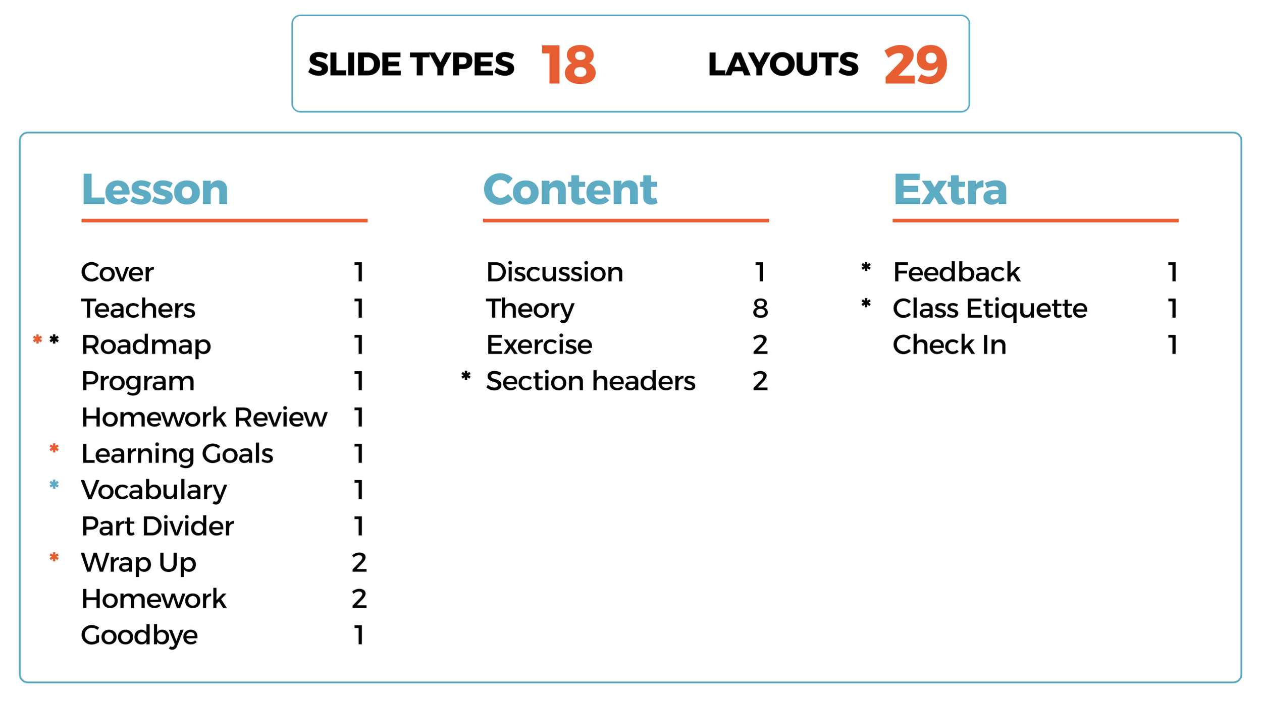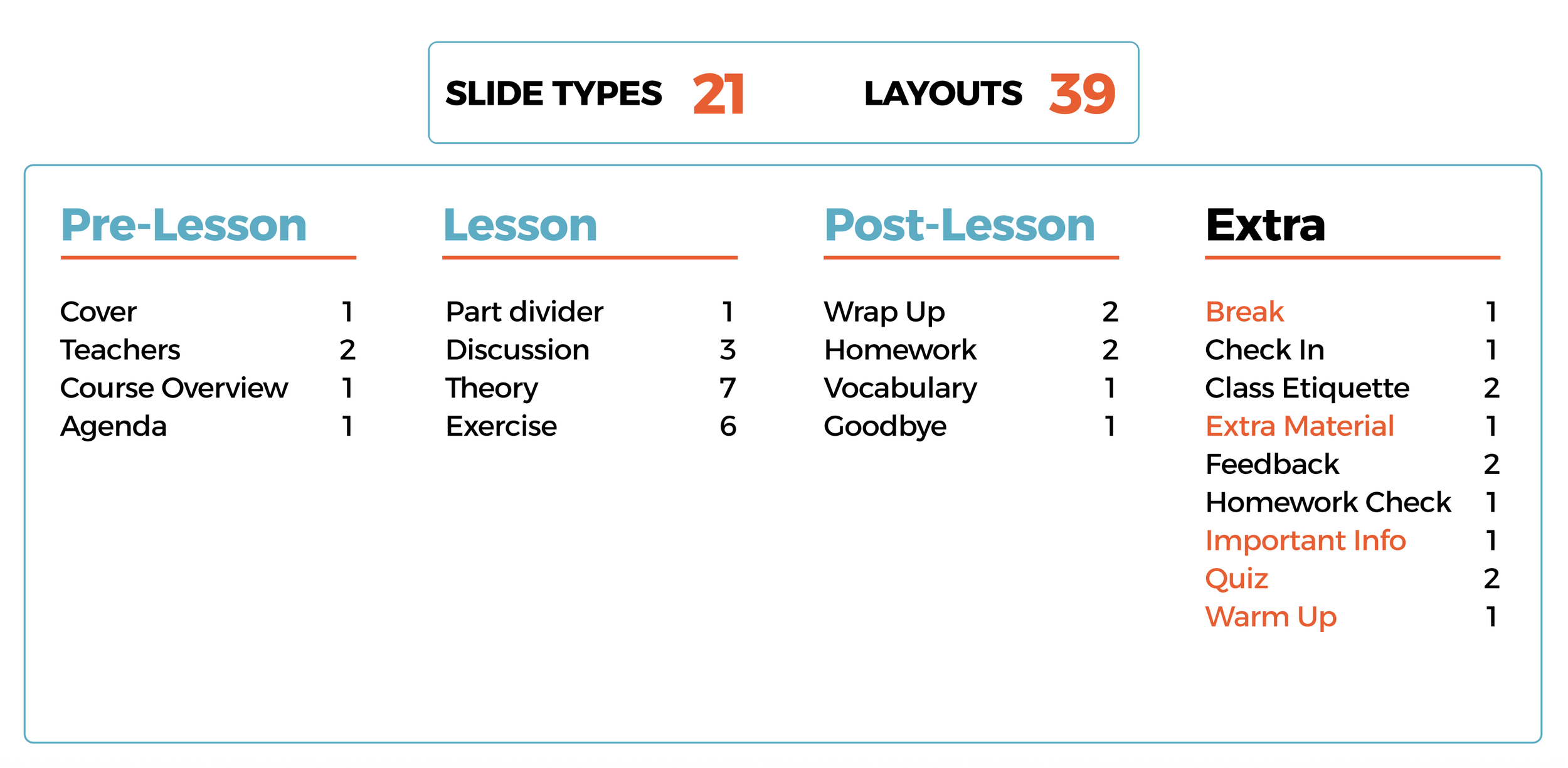 Layouts: The original template had 18 slide types and 29 layouts, with gaps in the lesson flow. The redesign expanded to 21 slide types and 39 layouts, organized into four clear phases: Pre-Lesson, Lesson, Post-Lesson, and Extra.