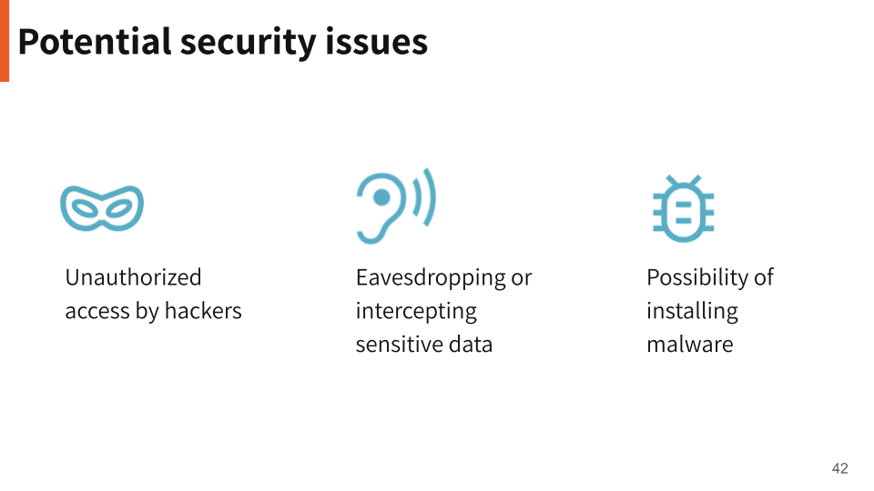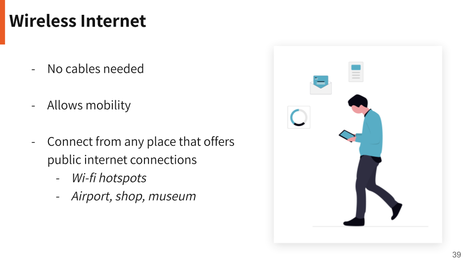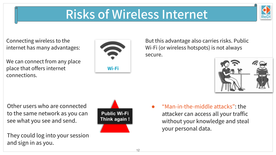 Theory — Wireless Internet: The original mixed text blocks, clip art, and competing visual elements with no clear hierarchy. The redesign separates the concept across focused slides — one for key points, one for the warning moment — giving each idea the space it needs to land.