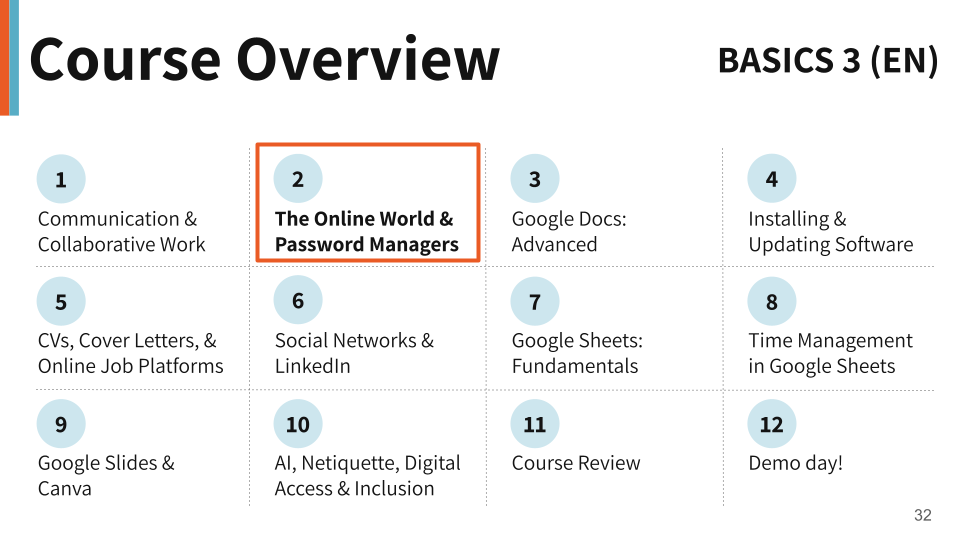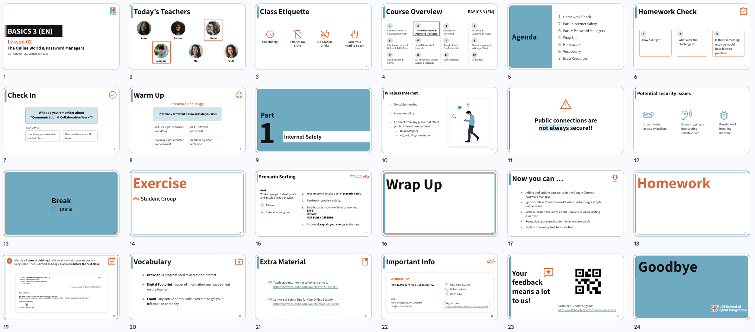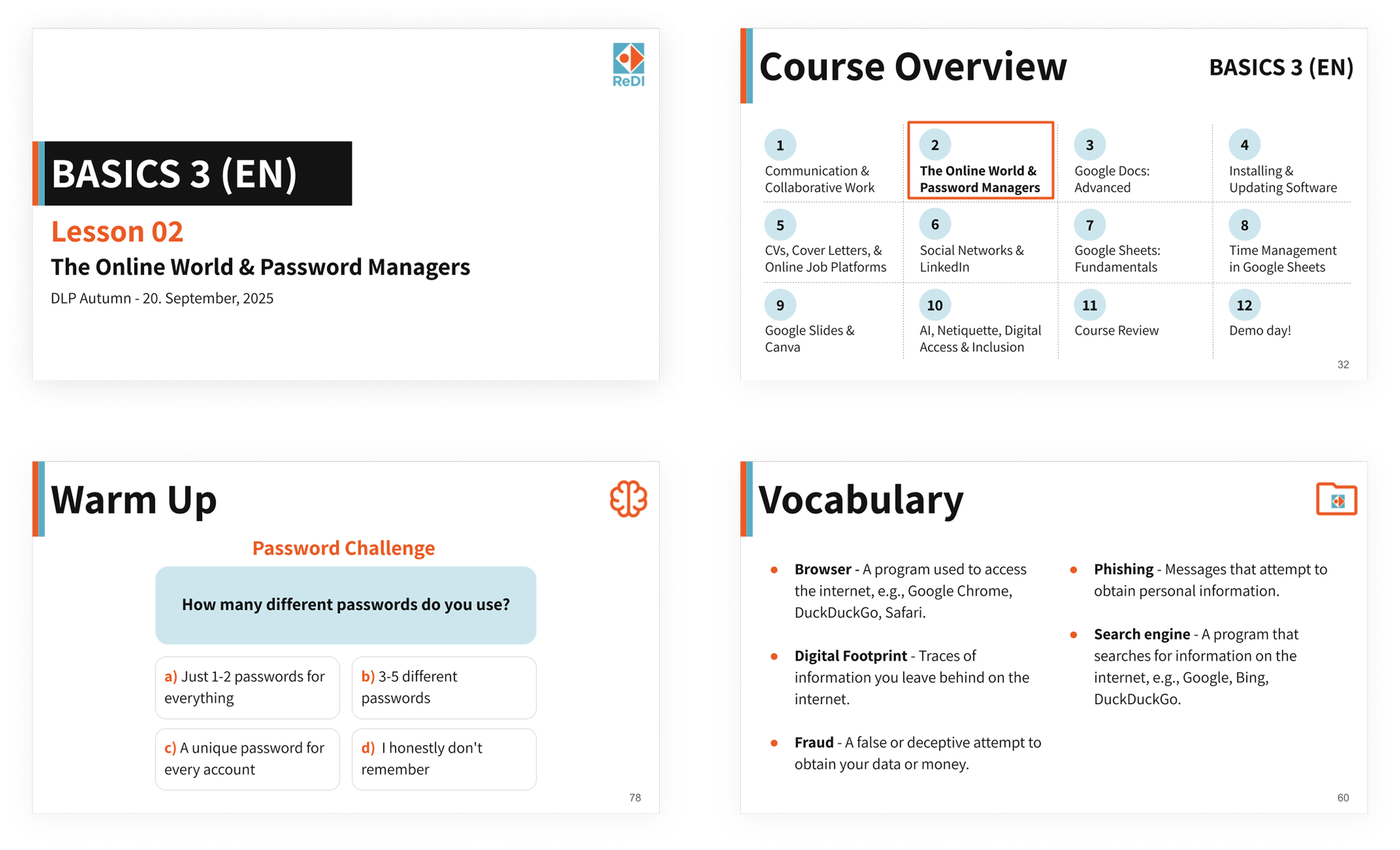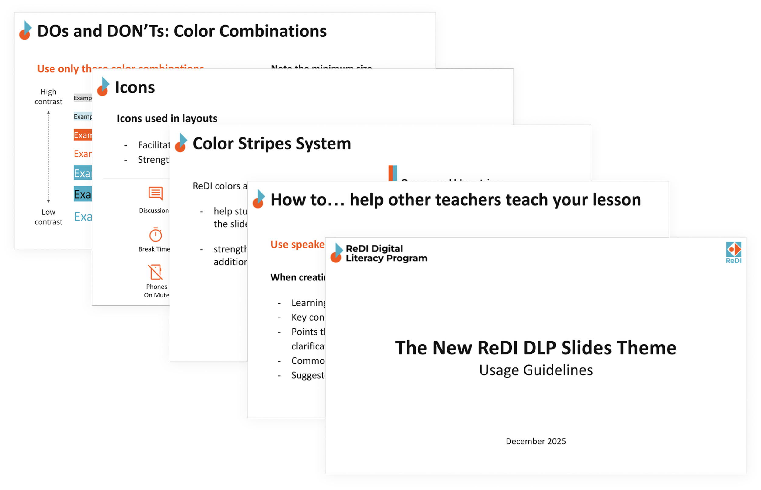 ReDI's Digital Literacy Program (DLP) offers 5 courses — 3 in German, 2 in English — each with 12 lessons and around 50 slides per lesson. That's over 3,000 slides edited by many different teachers over time, with inconsistent design guidance.