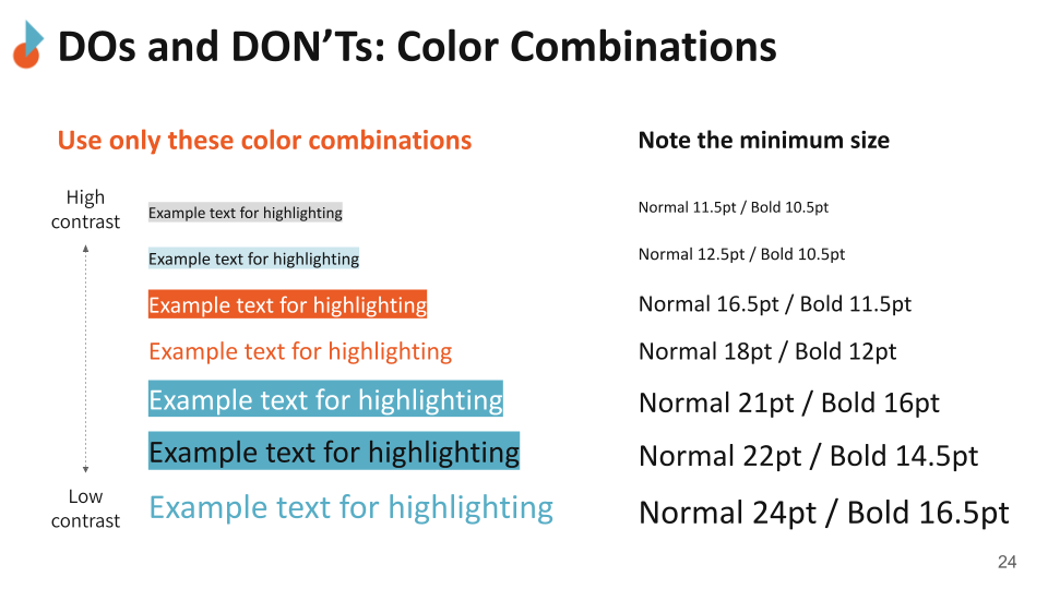 Specific rules cover color combinations, font and text sizes, text formatting, and image usage — with visual examples for each. The goal was to make the right choice obvious and the wrong choice hard to make accidentally.