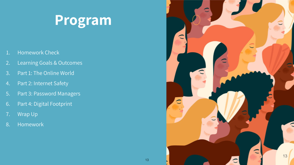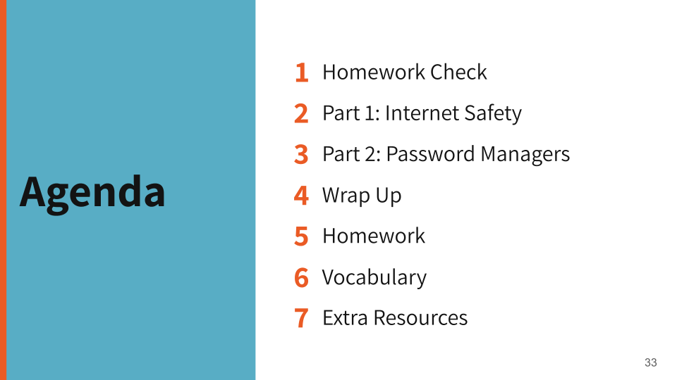 Agenda: The original placed the agenda list on a colored background with low contrast, alongside a decorative illustration that added no informational value. The new version uses high contrast, large numbered items, and removes decorative elements that distracted from the content.