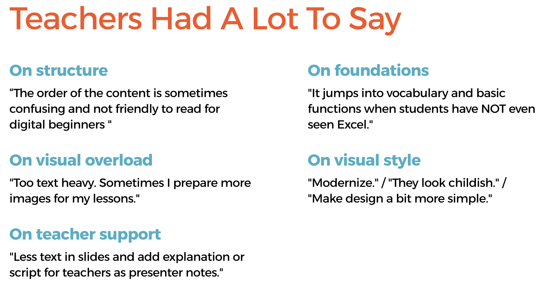 This gap between high satisfaction scores and specific qualitative concerns shaped the entire design direction: the problems weren't obvious enough to show up in ratings, but real enough to affect learning.