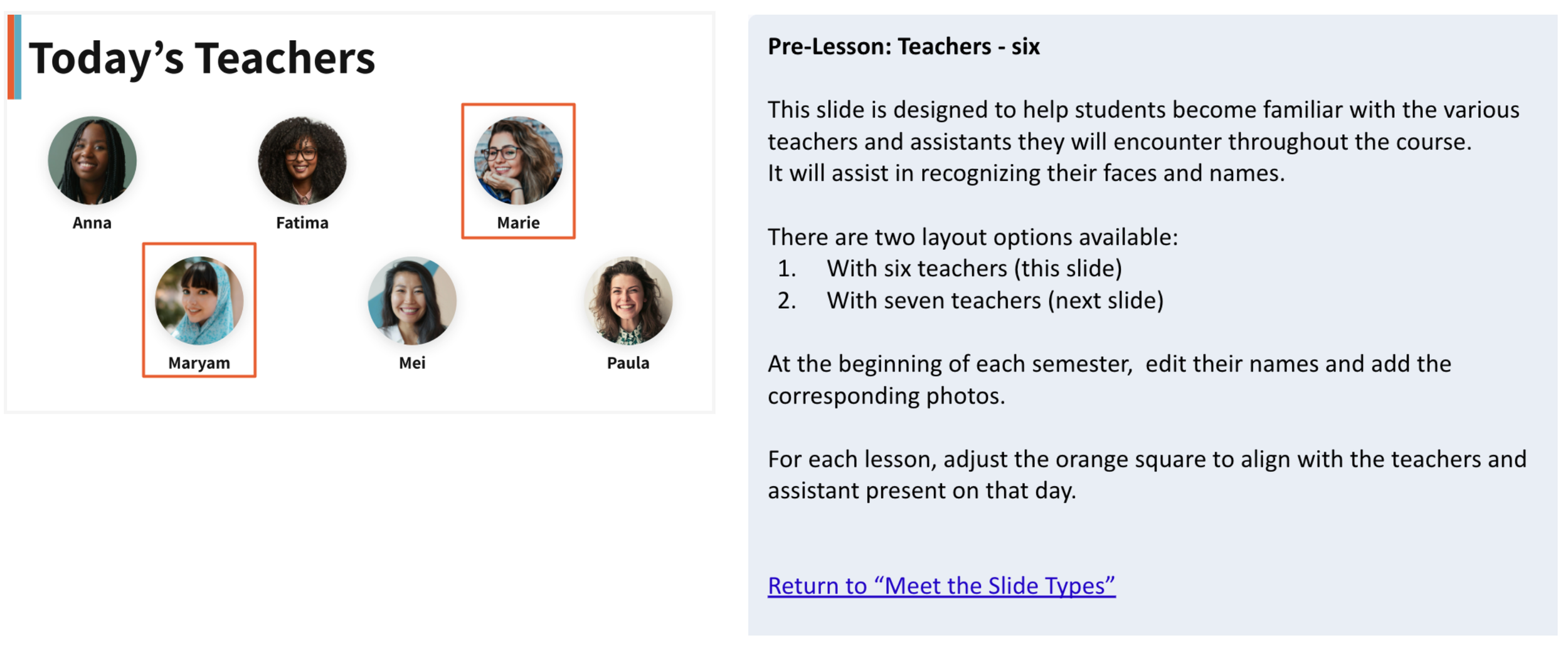 Each layout comes with a plain-language explanation of when to use it and what to edit — designed for teachers, not designers.