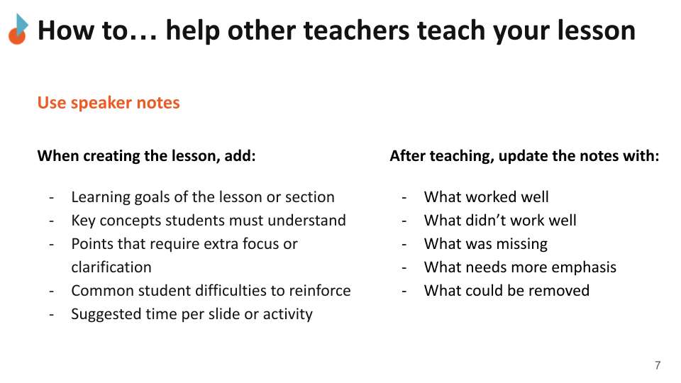 Speaker notes guidance helps teachers pass on their lessons to others — documenting what worked, what didn't, and what needs more emphasis